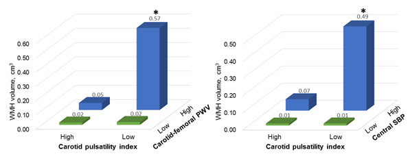 圖二: Comparisons of WMH volume between migraine patients divided by the medians of CPI, cf-PWV, and cSBP median quantiles. CPI, cf-PWV, and cSBP values were classified into low and high groups divided by median values (two quantiles for each variable). *P < 0.05 interaction effect, indicating CPI modulation of cf-PWV or cSBP effect on WMHs formation. Abbreviations: WMH, white matter hyperintensity; CPI, carotid pulsatility index; cf-PWV, carotid-femoral pulse wave velocity; and cSBP, central systolic blood pressure.